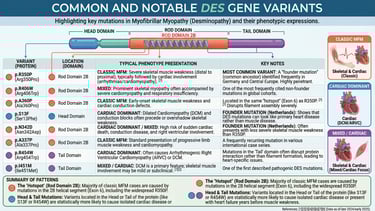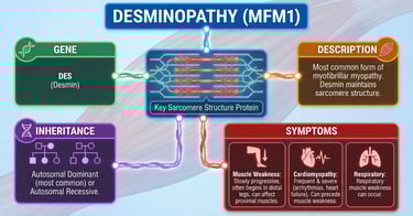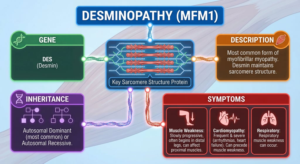 Desminopathy, also called desmin-related myofibrillar myopathy, is a rare genetic condition caused by DES gene mutations. It leads to abnormal protein aggregates in muscle cells, disrupting their structure and function. Symptoms often include progressive weakness starting in the legs, heart problems like arrhythmias, and sometimes breathing difficulties. Onset varies from childhood to adulthood, and while there's no cure, management focuses on symptoms like pacemakers for heart issues.