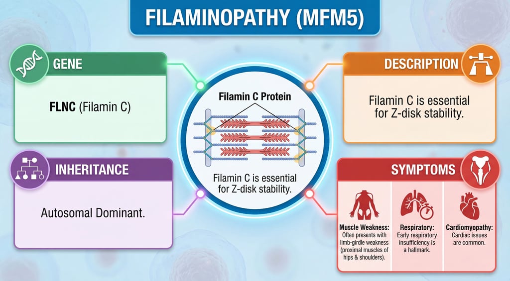 Muscle filaminopathy is a rare myofibrillar myopathy characterized by slowly progressive, proximal skeletal muscle weakness, which is initially more prominent in lower extremities and involves upper extremities with disease progression. Patients present with difficulty climbing stairs, a waddling gait, marked winging of scapula, lower back pain, paresis of limb girdle musculature, hypo-/areflexia and/or mild facial muscle weakness in rare cases. Respiratory muscle weakness is common and cardiac anomalies (conduction blocks, tachycardia, diastolic dysfunction, left ventricular hypertrophy) have been reported in some cases.